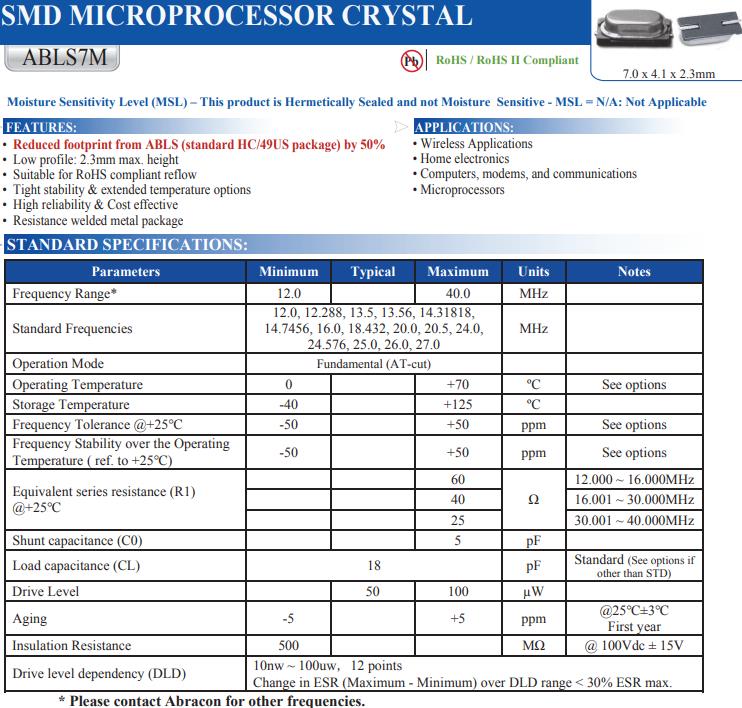 | ABLS7M2-18.432MHZ-D-2Y-T | Abracon晶振 | ABLS7M2 | MHz Crystal | 18.432MHz |