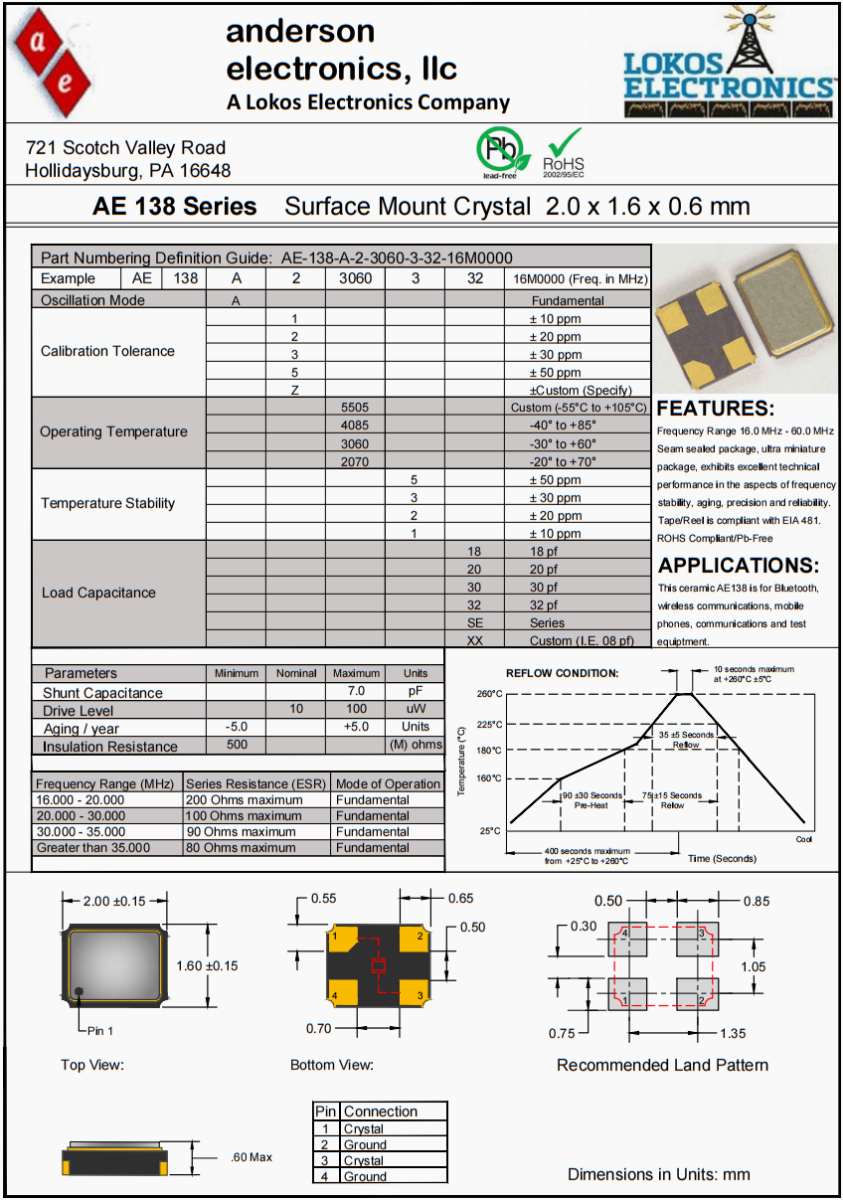 Anderson汽車輔助駕駛晶振,AE138高精度晶振,AE-138-A-2-4085-3-10-40M0000美國晶振,美國Anderson晶振公司,安德森晶振,進口晶振,AE-138晶振,無源晶振,石英晶振,貼片晶振,超小型晶振,2016晶振,無源晶振,貼片晶振,無人機晶振,汽車輔助駕駛晶振,歐美進口晶振,低損耗晶振,高品質晶振。該陶瓷AE138適用于藍牙,無線通信,移動電話,通信和測試設備等其他IT產品的晶振應用,三態功能,PC和LCDM等高端數碼領域,符合RoHS/無鉛。頻率范圍16.0 MHz - 60.0 MHz Seam密封封裝,超小型封裝,在頻率穩定性、老化性、精度和可靠性方面具有優異的技術性能。磁帶/卷軸符合EIA 481標準。