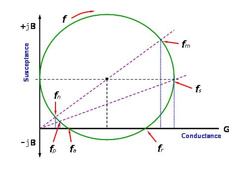 串聯偕振頻率及并聯偕振頻率, fs and fp ,是分別由電導(real part of the admittance)最大和阻抗(real part of the electric input impedance)最大時的頻率.