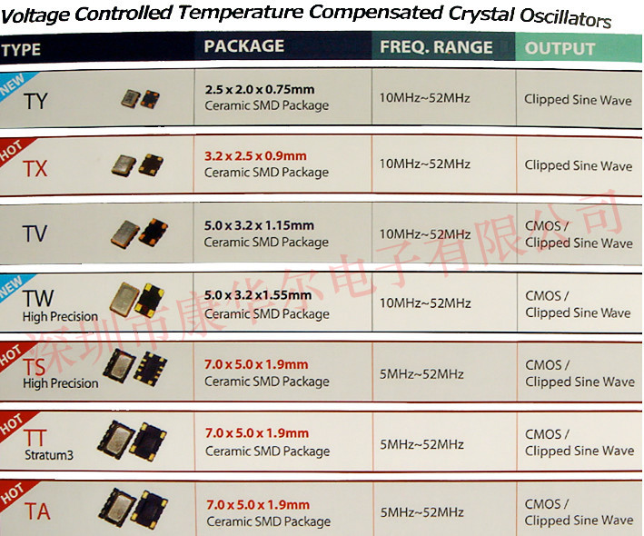 TA-7050溫補(bǔ)振蕩器,泰藝貼片晶體,進(jìn)口晶體振蕩器,溫補(bǔ)晶振(TCXO)產(chǎn)品本身具有溫度補(bǔ)償作用,高低溫度穩(wěn)定性:頻率精度高0.5 PPM?2.0 PPM,工作溫度范圍: - 30度?85度,電源電壓:1.8V?3.3V之間可供選擇,產(chǎn)品本身具有溫度電壓控制功能,世界上最薄的晶振封裝,頻率:26兆赫,33.6兆赫,38.4兆赫,40兆赫,因產(chǎn)品性能穩(wěn)定,精度高等優(yōu)勢(shì),被廣泛應(yīng)用到一些比較高端的數(shù)碼通訊產(chǎn)品領(lǐng)域,GPS全球定位系統(tǒng),智能手機(jī),WiMAX和蜂窩和無(wú)線通信等產(chǎn)品,符合RoHS/無(wú)鉛.