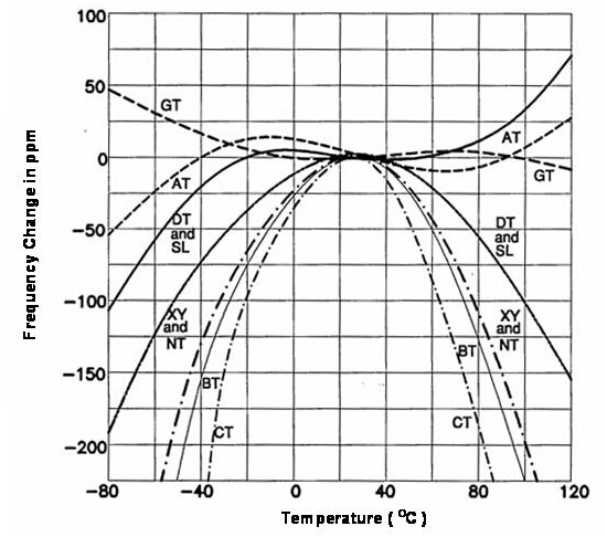 大部份的石英晶體產(chǎn)品是用于電子線路上的參考頻率基準(zhǔn)或頻率控制組件, 所以, 頻率與工作環(huán)境溫度的特性是一個很重要的參數(shù). 事實上, 良好的頻率與溫度(frequeny versus temperature)特性也是選用石英做為頻率組件的主要因素之一. 經(jīng)由適當(dāng)?shù)亩x及設(shè)計, 石英晶體組件可以很容易的就滿足到以百萬分之一 (parts per million, ppm) 單位等級的頻率誤差范圍. 若以離散電路方式將LCR零件組成高頻振蕩線路, 雖然也可以在小量生產(chǎn)規(guī)模達(dá)到所需要的參考頻率信號誤差在ppm或sub-ppm等級要求, 可是這種方式無法滿足產(chǎn)業(yè)要達(dá)到的量產(chǎn)規(guī)模. 石英組件的頻率對溫度特性更是離散振蕩線路無法簡易達(dá)成的. 在(圖四) 中提供了數(shù)種不同的石英晶體切割角度的頻率對溫度特性曲線.