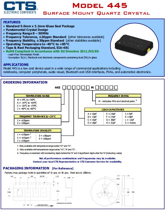 CTS晶振445,445C25D25M00000陶瓷晶振,西迪斯晶振,無源晶振,SMD晶振,無源諧振器,水晶振動子,無源貼片晶體,5032mm陶瓷諧振器,型號445,編碼445C25D25M00000是一款陶瓷面兩腳貼片型的音叉晶體,采用先進的生產技術打磨而成,產品具備良好的穩定性能,445型是一種低成本的設備,廣泛應用于商業應用,包括筆記本電腦、電腦外設、視聽、藍牙和USB接口、pda和汽車電子產品。