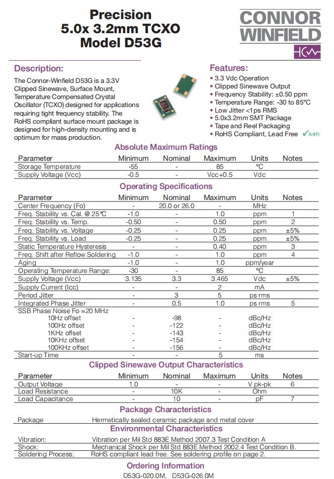 D53G-020.0M|TCXO晶振振蕩器|6G路由器晶振 參數(shù)表