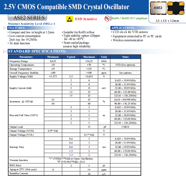 ABRACON晶振,ASE2-22.000MHZ-ET晶振,ASE2晶振,有源晶體振蕩器.3225mm體積非常小的SMDcrystal器件,是民用小型無(wú)線數(shù)碼產(chǎn)品的最佳選擇,小體積的晶振被廣泛應(yīng)用到,手機(jī)藍(lán)牙,GPS定位系統(tǒng),無(wú)線通訊集,高精度和高頻率的穩(wěn)定性能,非常好的減少電磁干擾的影響,是民用無(wú)線數(shù)碼產(chǎn)品最好的選擇,符合RoHS/無(wú)鉛.