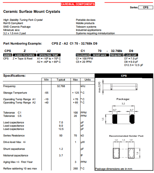 Cardinal晶振,CPS晶振,SMD石英晶體.貼片表晶32.768K系列具有超小型,薄型,質(zhì)地輕的表面貼片音叉型石英晶體諧振器,晶振產(chǎn)品本身具備優(yōu)良的耐熱性,耐環(huán)境特性,在辦公自動(dòng)化,家電領(lǐng)域,移動(dòng)通信領(lǐng)域可發(fā)揮優(yōu)良的電氣特性,符合無(wú)鉛標(biāo)準(zhǔn),滿足無(wú)鉛焊接的回流溫度曲線要求,金屬外殼的石英晶振使得產(chǎn)品在封裝時(shí)能發(fā)揮比陶瓷晶振外殼更好的耐沖擊性能.