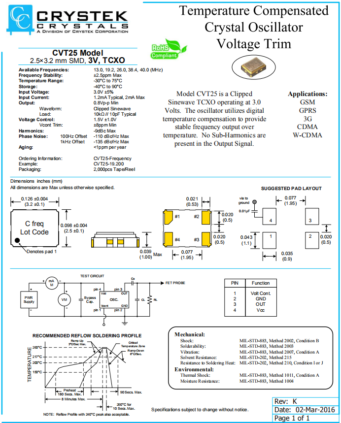 CRYSTEK晶振,CVT25晶振,溫補晶體振蕩器.小型SMD有源晶振,從最初超大體積到現(xiàn)在的7050mm,6035mm,5032mm,3225mm,2520mm體積,有著翻天覆地的改變,體積的變小也試產品帶來了更高的穩(wěn)定性能,接縫密封石英晶體振蕩器,精度高,覆蓋頻率范圍寬的特點,SMD高速自動安裝和高溫回流焊設計,Optionable待機輸出三態(tài)輸出功能,電源電壓范圍:1.8V?5V,高穩(wěn)定性,低抖動,低功耗,主要應用領域:無線通訊,高端智能手機,平板筆記本WLAN,藍牙,數碼相機,DSL和其他IT產品的晶振應用,三態(tài)功能,PC和LCDM等高端數碼領域,符合RoHS/無鉛.