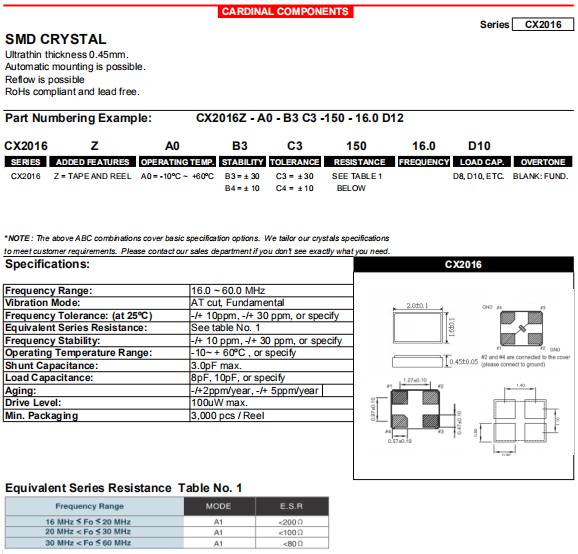 | Cardinal晶振 | 單位 | CX2016晶振 | 石英晶振基本條件 |