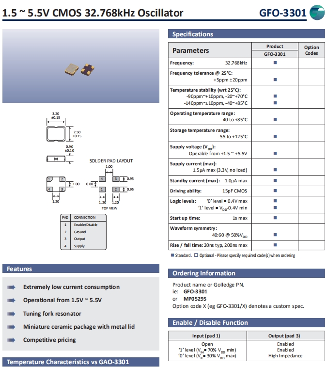 Golledge晶振,GFO-3301晶振,時鐘晶體振蕩器.小體積貼片時鐘晶體諧振器,是貼片音叉晶體,千赫頻率元件,應用于時鐘模塊,智能手機,導航定位系統(tǒng),因產品本身體積小,貼片編帶型,可應用于高性能自動貼片焊盤,被廣泛應用到各種小巧的便攜式消費電子數(shù)碼時間產品,環(huán)保性能符合ROHS/無鉛認證.