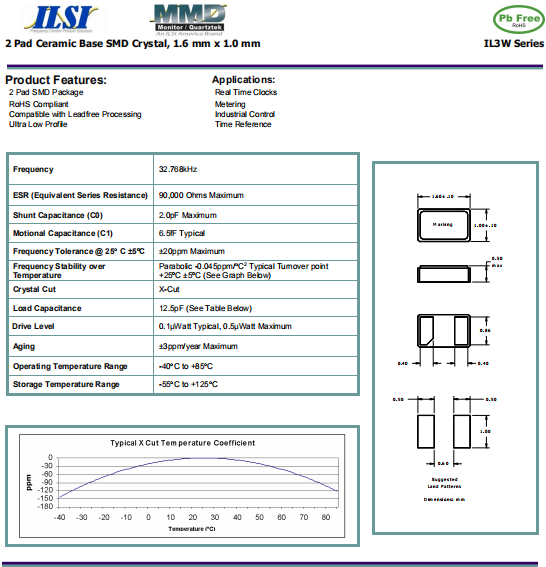 ILSI晶振,IL3W晶振,石英晶體諧振器.32.768K系列具有超小型,薄型,質地輕的表面貼片音叉型石英晶體諧振器,晶振產品本身具備優良的耐熱性,耐環境特性,在辦公自動化,家電領域,移動通信領域可發揮優良的電氣特性,符合無鉛標準,滿足無鉛焊接的回流溫度曲線要求,金屬外殼的石英晶振使得產品在封裝時能發揮比陶瓷晶振外殼更好的耐沖擊性能.
