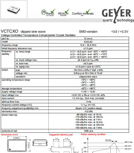 Geyer晶振,KXO-83晶振,壓控溫補振蕩器.小型SMD有源晶振,從最初超大體積到現在的7050mm,6035mm,5032mm,3225mm,2520mm體積,有著翻天覆地的改變,體積的變小也使產品帶來了更高的穩定性能,接縫密封石英晶體振蕩器,精度高,覆蓋頻率范圍寬的特點,SMD高速自動安裝和高溫回流焊設計,Optionable待機輸出三態輸出功能,電源電壓范圍:1.8V?5 V,高穩定性,低抖動,低功耗,主要應用領域:無線通訊,高端智能手機,平板筆記本WLAN,藍牙,數碼相機,DSL和其他IT產品的晶振應用,三態功能,PC和LCDM等高端數碼領域,符合RoHS/無鉛.