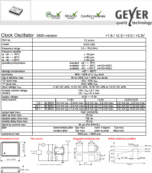 Geyer晶振,KXO-V95晶振,低功耗振蕩器.2520mm體積的晶振,可以說是目前小型數(shù)碼產(chǎn)品的福音,目前超小型的智能手機里面所應用的就是小型的石英晶振,該產(chǎn)品最適用于無線通訊系統(tǒng),無線局域網(wǎng),已實現(xiàn)低相位噪聲,低電壓,低消費電流和高穩(wěn)定度,超小型,質(zhì)量輕等產(chǎn)品特點,產(chǎn)品本身編帶包裝方式,可對應自動高速貼片機應用,以及高溫回流焊接(產(chǎn)品無鉛對應),為無鉛產(chǎn)品.