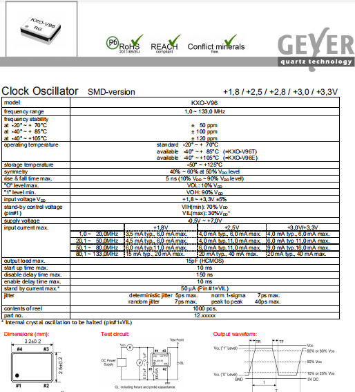 Geyer晶振,KXO-V96晶振,時(shí)鐘有源振蕩器.貼片式石英晶體振蕩器,低電壓?jiǎn)?dòng)功率,并且有多種電壓供選擇,比如有1.8V,2.5V,3.3V,3.8V,5V等,產(chǎn)品被廣泛應(yīng)用于,平板筆記本,GPS系統(tǒng),光纖通道,千兆以太網(wǎng),串行ATA,串行連接SCSI,PCI-Express的SDH / SONET發(fā)射基站等領(lǐng)域.符合RoHS/無鉛.