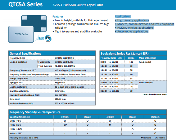 Quarztechnik晶振,QTC5A晶振,高質量石英晶體.小體積貼片5032晶振,外觀小型,表面貼片型石英晶體諧振器,因本身體積小等優(yōu)勢,適用于移動通信終端的基準時鐘等移動通信領域.小型,薄型,輕型(5.0×3.2×0.8mmtyp.)具備優(yōu)良的耐環(huán)境特性及高耐熱性強.滿足無鉛焊接的回流溫度曲線要求.