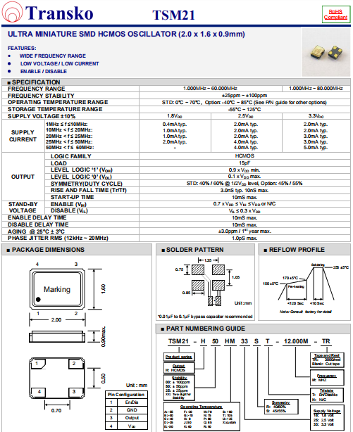 Transko晶振,TSM21晶振,低抖動石英振蕩器.智能手機(jī)晶振,產(chǎn)品具有高精度超小型的表面貼片型石英晶體振蕩器,最適用于移動通信終端的基準(zhǔn)時鐘等移動通信領(lǐng)域.比如智能手機(jī),無線通信,衛(wèi)星導(dǎo)航,平臺基站等較高端的數(shù)碼產(chǎn)品,晶振本身小型,薄型具備各類移動通信的基準(zhǔn)時鐘源用頻率,貼片晶振具有優(yōu)良的電氣特性,耐環(huán)境性能適用于移動通信領(lǐng)域,滿足無鉛焊接的高溫回流溫度曲線要求.
