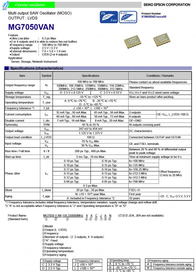 | X1M0004210007 | MG7050VAN | 156.250000 MHz | 7.00 x 5.00 x 1.60 mm | LVDS | 2.970 to 3.630 V |