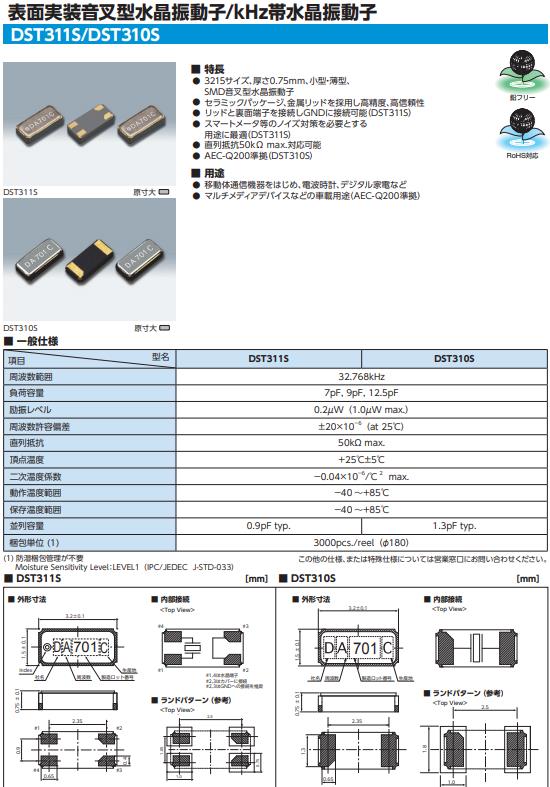DST310S石英諧振器,KDS日本晶振,1TJF080DP1AI00P晶體,32.768KHz時鐘晶體具有小型,薄型,輕型的貼片晶振表面音叉型晶體振蕩器,產品具有優良的耐熱性,耐環境特性,可發揮晶振優良的電氣特性,符合RoHS規定,滿足無鉛焊接的高溫回流溫度曲線要求,金屬外殼的封裝使得產品在封裝時能發揮比陶瓷振蕩器外殼更好的耐沖擊性.