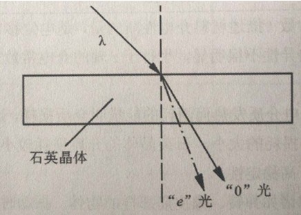 石英晶體也與其它一些物質(zhì)(如方解石CaCO3、硝酸鈉NaNO3晶體等)那樣具有雙折射現(xiàn)象,即一束光射入石英晶體時(shí),分裂成兩束沿不同方向傳拓的光其中一束光遵循折射定律,叫做尋常光或稱“0”光,另一束光不遵循折射定律,叫做非尋常光,又稱“e”光,如圖1.3.1所示,尋常光在石英晶體內(nèi)部各個(gè)方向上的折射率mo是相等的,而非尋常光在石英晶體的內(nèi)部各個(gè)方向的折射率n0卻是不相等的。例如:對(duì)于波長(zhǎng)為5893A的光,石英晶體的n0=1.54425,最大的ne=1.5536。石英晶體雖然具有雙折射現(xiàn)象,但當(dāng)光沿z軸方向入射時(shí),不發(fā)生雙折射現(xiàn)象,所以又稱z軸為光軸