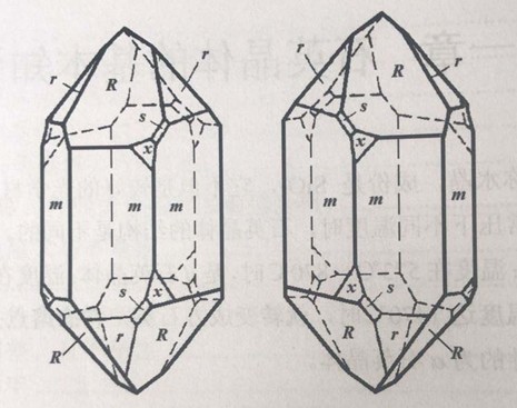 在結晶學中,石英晶體諧振器內部結構可以概括為是由一些“點子”在空間有規則地作周期的無限分布:“點子”代表原子、離子、分子或其集團的重心。這些“點子”的總體稱為點陣,構成石英晶體的是二氧化硅分子,而二氧化硅分子的重心又正好與硅離子重合,因此硅離子的點陣就可以反映出石英晶體的內部結構。石英晶體的各層硅離子若按右手螺旋規則分布,則稱為右旋石英晶體;若按左手螺旋規則分布,稱為左旋石英晶體。從外形上看,右旋石英晶體的s面在R面的右下方或m面的左上方,左旋石英晶體的s面在R面的左下方或m面的右上方(見圖1.1.1),它們互為鏡象對稱。
