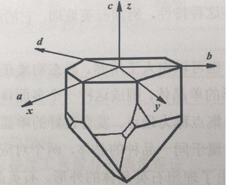 晶體內部結構的規律性,造成了它在外形上的對稱性。例如:晶體可以有對稱軸、對稱中心、對稱面等對稱元素。石英晶體存在一個三次對稱軸(或三次軸即晶體繞該軸旋360°3后能夠復原)和三個互成120°的二次軸,如圖1.1.2中的a、b、d軸 圖1.1.2石英晶體的對稱軸和直角坐標系