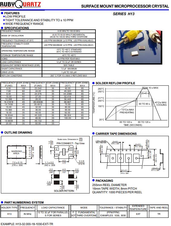 Rubyquartz晶體,H13無源諧振器,H13-12.000-18-1030-EXT-TR貼片晶振,貼片晶振本身體積小,超薄型石英晶體振蕩器,特別適用于有目前高速發(fā)展的高端電子數(shù)碼產(chǎn)品,因?yàn)榫д癖旧硇⌒突枨蟮氖袌?chǎng)領(lǐng)域,小型,薄型是對(duì)應(yīng)陶瓷振蕩器(偏差大)和普通的石英晶體振蕩器(偏差小)的中間領(lǐng)域的一種性價(jià)比較出色的產(chǎn)品.產(chǎn)品廣泛用于筆記本電腦,無線電話,衛(wèi)星導(dǎo)航SSD,USB,Blu-ray等用途,符合無鉛焊接的高溫回流焊曲線特性.