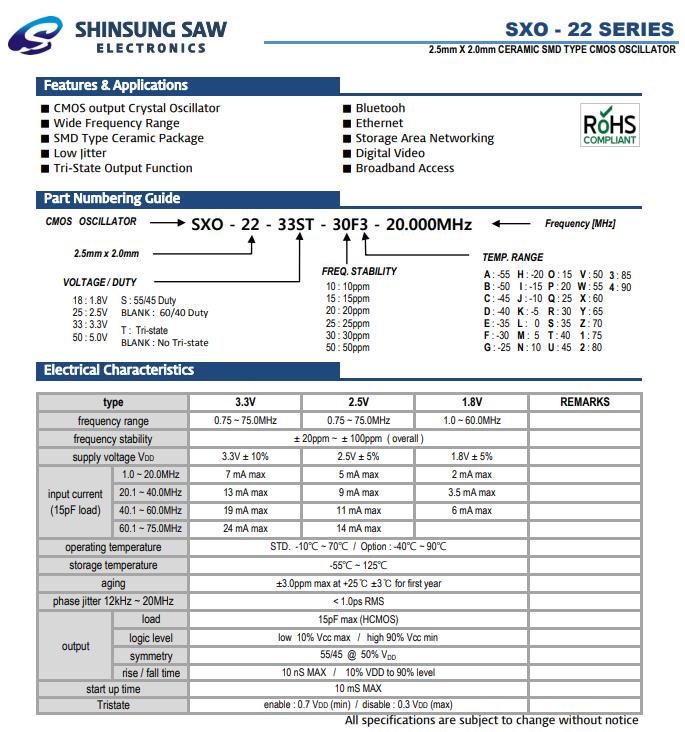 韓國新松晶振,SXO-22晶體振蕩器,SXO-22-15ST-30F3-20.000MHz晶振,有源晶振,是指晶體本身起振需要外部電壓供應,起振后可直接驅動CMOS集成電路,產品本身已實現與薄型IC(TSSOP封裝,TVSOP封裝)同樣的1mm厚度,斷開時的消費電流是15µA以下,編帶包裝方式可對應自動搭載及IR回流焊接(無鉛對應)產品有幾種電壓供選1.8V,2.5V,3V3.3V,5V,以應對不同IC產品需要.