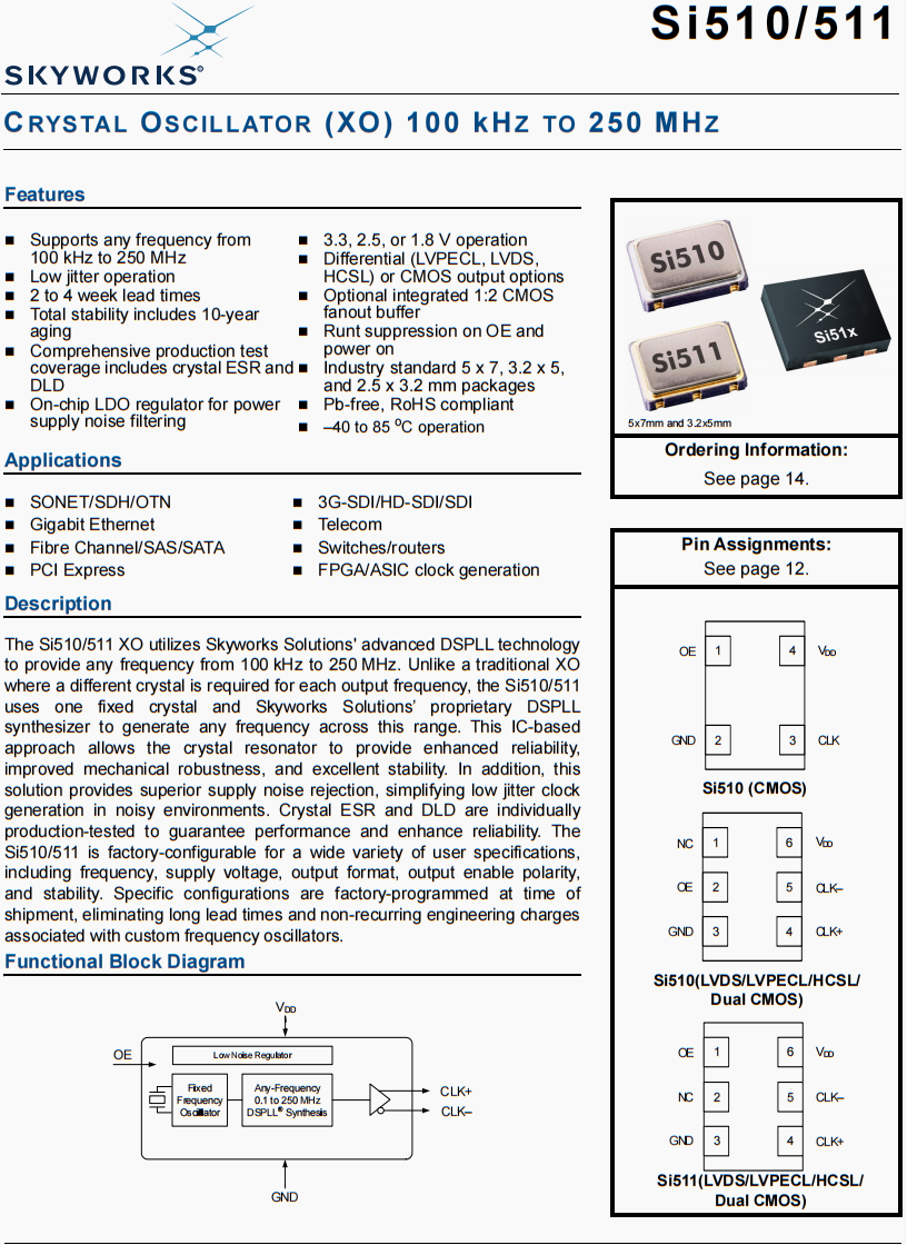 | 511BCA156M250AAG | Skyworks晶振 | Si511 | XO | 156.25 MHz | LVDS | 3.3V | ±20ppm |