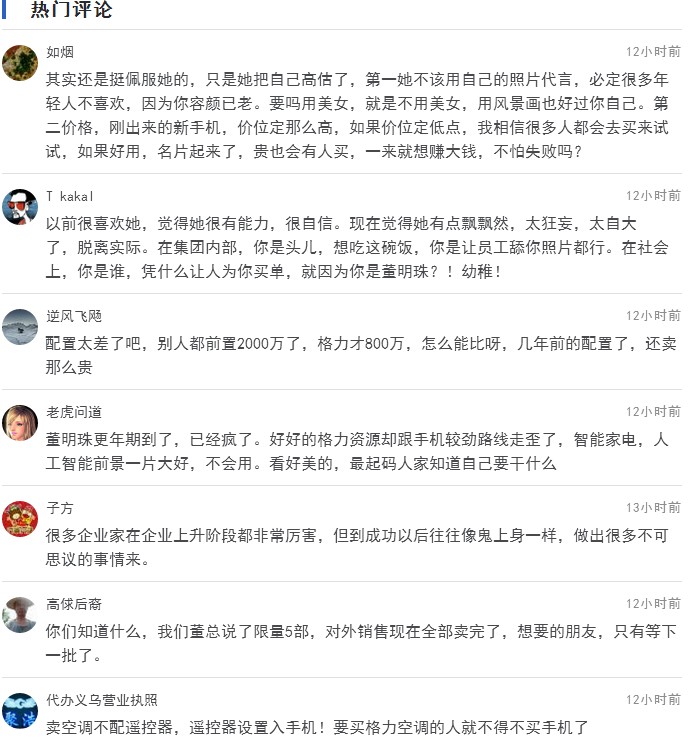 根據(jù)格力官方銷售平臺(tái)顯示,目前只賣出5臺(tái),這款手機(jī)據(jù)說是董明珠親自代言做廣告,手機(jī)開機(jī)畫面即為董明珠本人,希望能讓國人愛上中國制造。這銷量可真是震驚了整個(gè)手機(jī)界。之前董明珠大膽放言:“華為賣老大,我就賣老二嘛。”但是,理想很美好,現(xiàn)實(shí)卻很殘酷。董明珠的豪言與現(xiàn)在目前銷量上很不符合,由此,各種聲音此起彼伏“董大媽對于這你真不怕被打臉么?”借助網(wǎng)友的話,"那個(gè)開機(jī)畫面,實(shí)在是看著心累,董大媽太搶鏡。""建議董大媽不要再折騰做手機(jī)了,好好做格力空調(diào)吧,把空調(diào)質(zhì)量再進(jìn)一步的完美"等等之類的話,可讓網(wǎng)友們操碎了心,我們來看看網(wǎng)友的一些評論,此評論來源由騰訊網(wǎng):