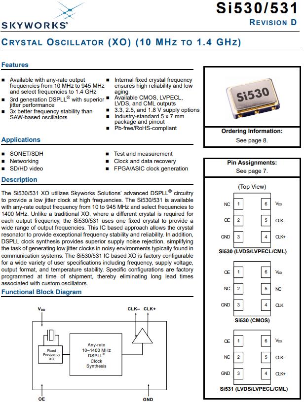 具備快速交貨Silicon高質量的時鐘晶體振蕩器編碼曝光530CA40M0000BG,Silicon作為歐美頻率元器件的佼佼者,致力于幫助用戶解決在晶振產品所遇到的問題,同時提供完美的晶振解決方案,隨著需求增長,Silicon很自豪宣布編碼530CA40M0000BG,型號Si530,尺寸為7050mm,頻率為40MHz,電壓3.3V,頻率穩定度50ppm,Si530/531 XO時鐘晶體振蕩器采用Skyworks Solutions先進的DSPLL®電路 在高頻率下提供低抖動時鐘。Si530/531是可用的 任意速率輸出頻率從10到945MHz和選擇頻率到1400MHz。不像傳統的XO,需要不同的晶體 每個輸出頻率,Si530/531使用一個固定晶體提供 寬輸出頻率范圍。這種基于集成電路的方法允許晶體諧振器,提供卓越的頻率穩定性和可靠性。此外, DSPLL時鐘合成提供優越的電源噪聲抑制,簡化 在嘈雜的環境中產生低抖動時鐘的任務 通信系統?;赟i530/531 IC的XO是工廠可配置的 適用于多種用戶規格,包括頻率,電源電壓, 輸出格式、溫度穩定。具體配置為出廠配置 在發貨時編程,從而消除了與定制振蕩器相關的長交貨時間.
