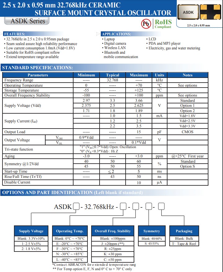 | ASDK-32.768KHZ-LRT | Abracon Crystal | ASDK | XO (Standard) | 32.768kHz | 3.3V |