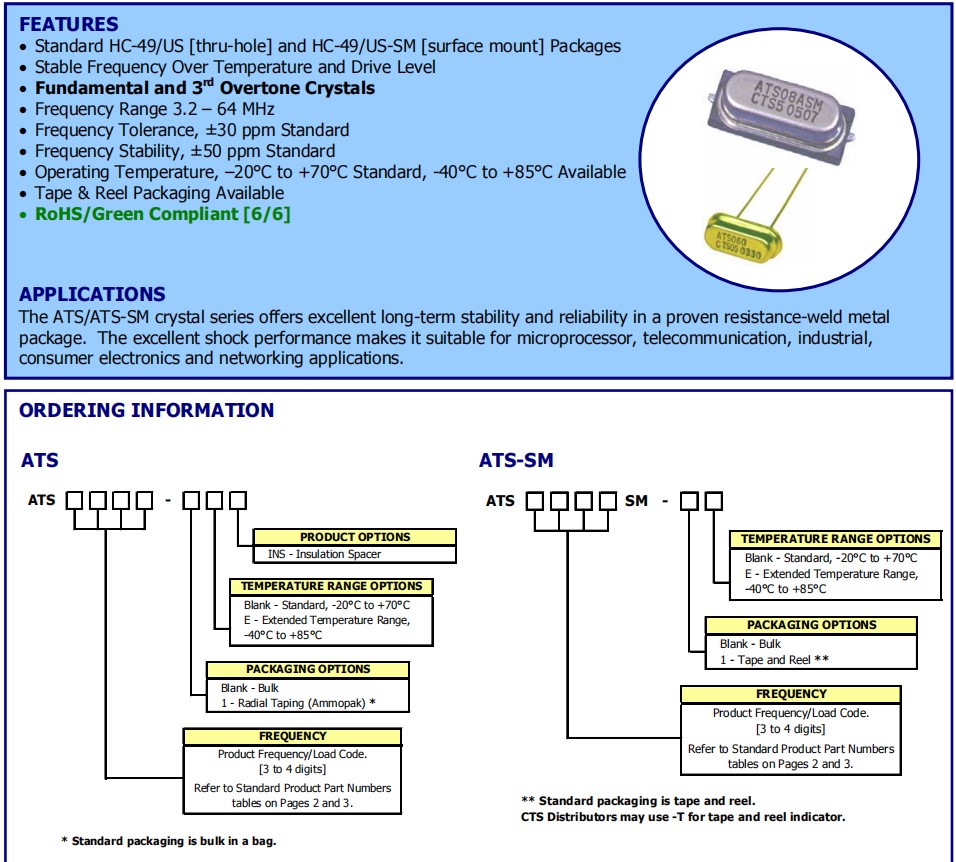 | ATS036SM-1E | CTS晶振 | ATS-SM | MHz Crystal | 3.579545MHz |