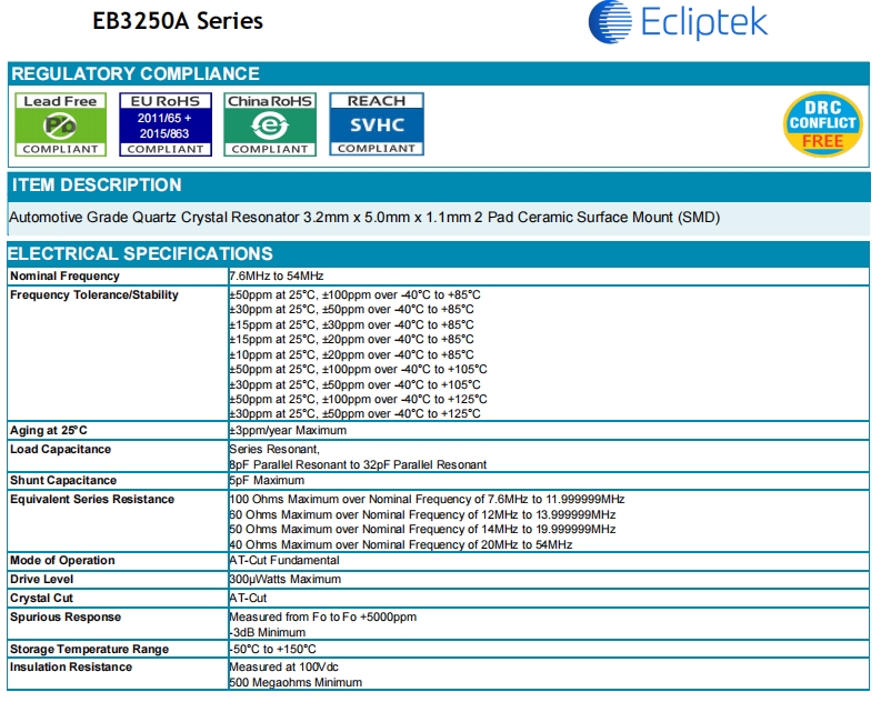 首頁晶振官方博客 專屬于汽車電子控制板的Ecliptek高質量晶振編碼EB3250YA12-12.000M TR