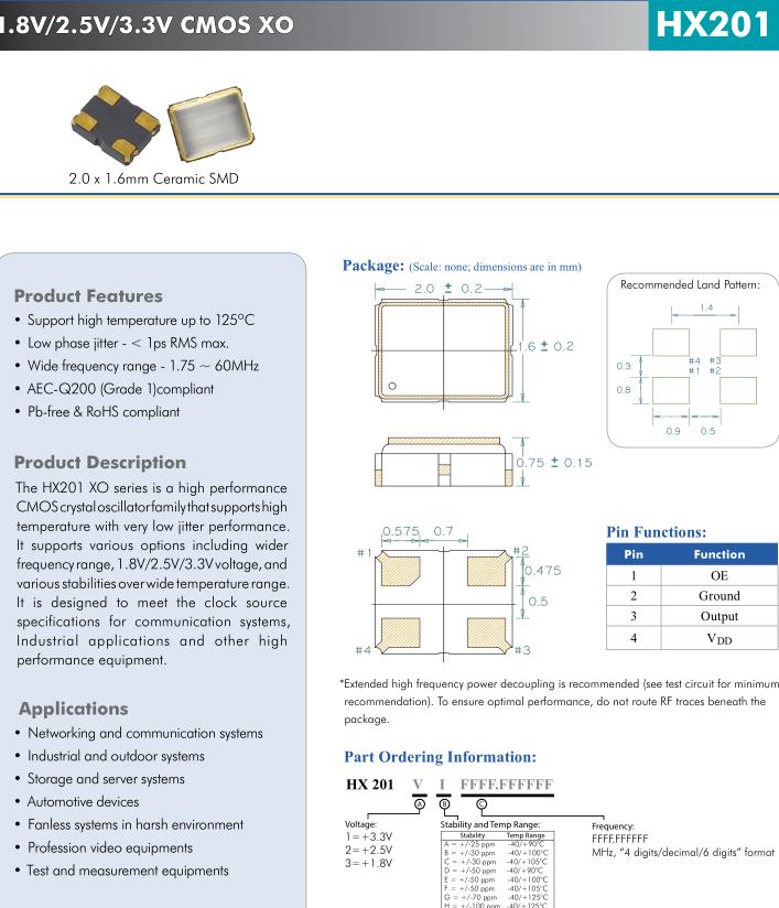 HX201 XO系列是高性能的CMOS時(shí)鐘晶體振蕩器家族,支持具有極低抖動(dòng)性能的高溫度。它支持各種選項(xiàng),包括更廣泛頻率范圍,1.8V/2.5V/3.3V電壓,和在較寬的溫度范圍內(nèi)具有多種穩(wěn)定性。它是為滿足時(shí)鐘源而設(shè)計(jì)的通信系統(tǒng)規(guī)范,工業(yè)應(yīng)用等較高設(shè)備性能。
