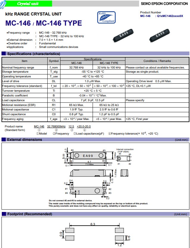 | Q13MC1462000100 | 7x1.5x1.4mm | MC-146 | 32.768kHz | 7pF | +/-20.0ppm | -40 to +85°C |