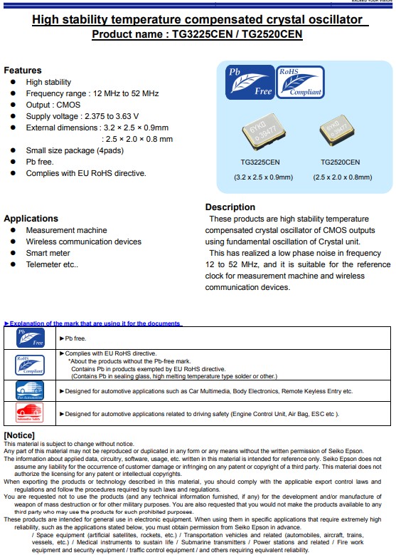 日本愛普生晶振TG2520CEN,是一款TCXO溫補晶振,小體積晶振尺寸2.5x2.0mm有源晶振,四腳貼片晶振,石英晶體振蕩器,電源電壓2.375V至3.63V,具有高穩定溫度CMOS輸出的補償晶體振蕩器,超小型,輕薄型,低抖動,低功耗,低損耗,低耗能,低電源電壓,高穩定性等特點,利用晶體單元的基本振蕩。這實現了頻率中的低相位噪聲12MHz至52MHz,適合用作基準電壓源,無線通信設備,智能電表,遙測儀,測量機器和無線的時鐘通訊設備。