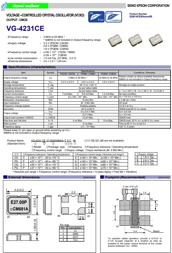 | Q3614CE00001100 | VG-4231CE | 27.000000MHz | 3.20x2.50x1.05mm | CMOS |