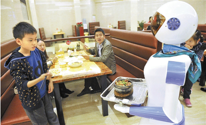 這是一家餐廳剛剛開業,里面有5個機器人:兩個送餐,并且能報出各種菜名,三個小機器人在門口跳舞助興。機器人送餐、跳舞助興,這些以往只能在科幻電影中看到的場面,在寧波慈溪的一家餐廳成為現實。據老板利用機器人送餐,相比雇人,光兩個送菜機器人一年能省20多萬元。