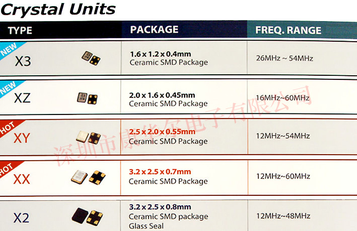 泰藝晶振,XY-2520晶體,進口石英晶體諧振器,隨著科技數碼產品的小型化發展,晶體元件的尺寸也從最初的插件龐大體積演變成目前的多種規格SMD小尺寸趨勢,目前晶體內部的石英晶片已經達到了+-0.002mm以內了,由于很多晶振廠家在生產小尺寸時所產生的問題,晶片很小導致晶體的各類寄生波(如長度伸縮振動,面切變振動)與主振動(厚度切變振動)的耦合加強,從而造成如若晶片的長度或寬度尺寸設計不正確、使得振動強烈耦合導致晶片不能正常工作,在隨著長時間的研究目前小尺寸的晶體已完全走入了成熟的階段。