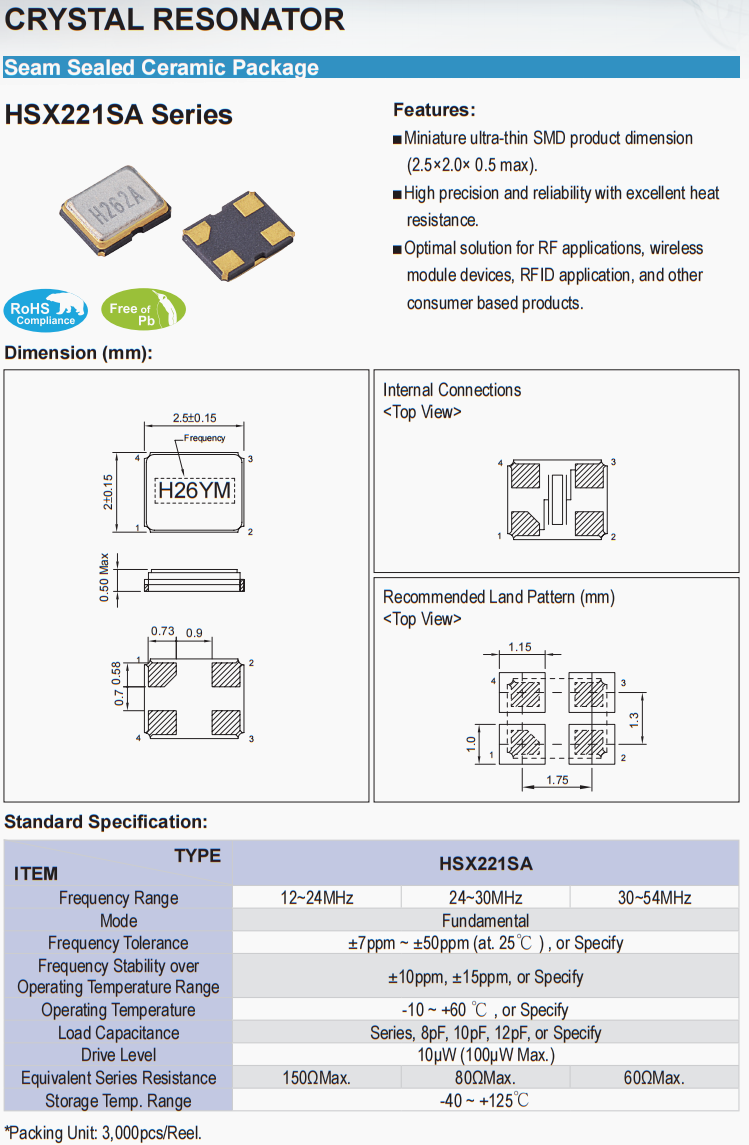 | X2B012000B91H-U | 加高晶振 | HSX221SA | 12 MHz | ±10ppm | 9pF |