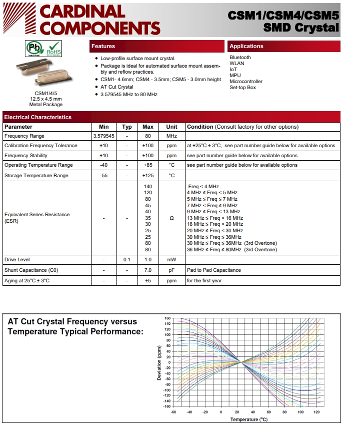 | CSM1Z-ARB3C3-50-14.7456D18 | Cardinal晶振 | CRYSTAL 14.7456MHZ 18PF SMD | CSM1 | 14.7456MHz | ±30ppm | -40°C ~ 125°C |